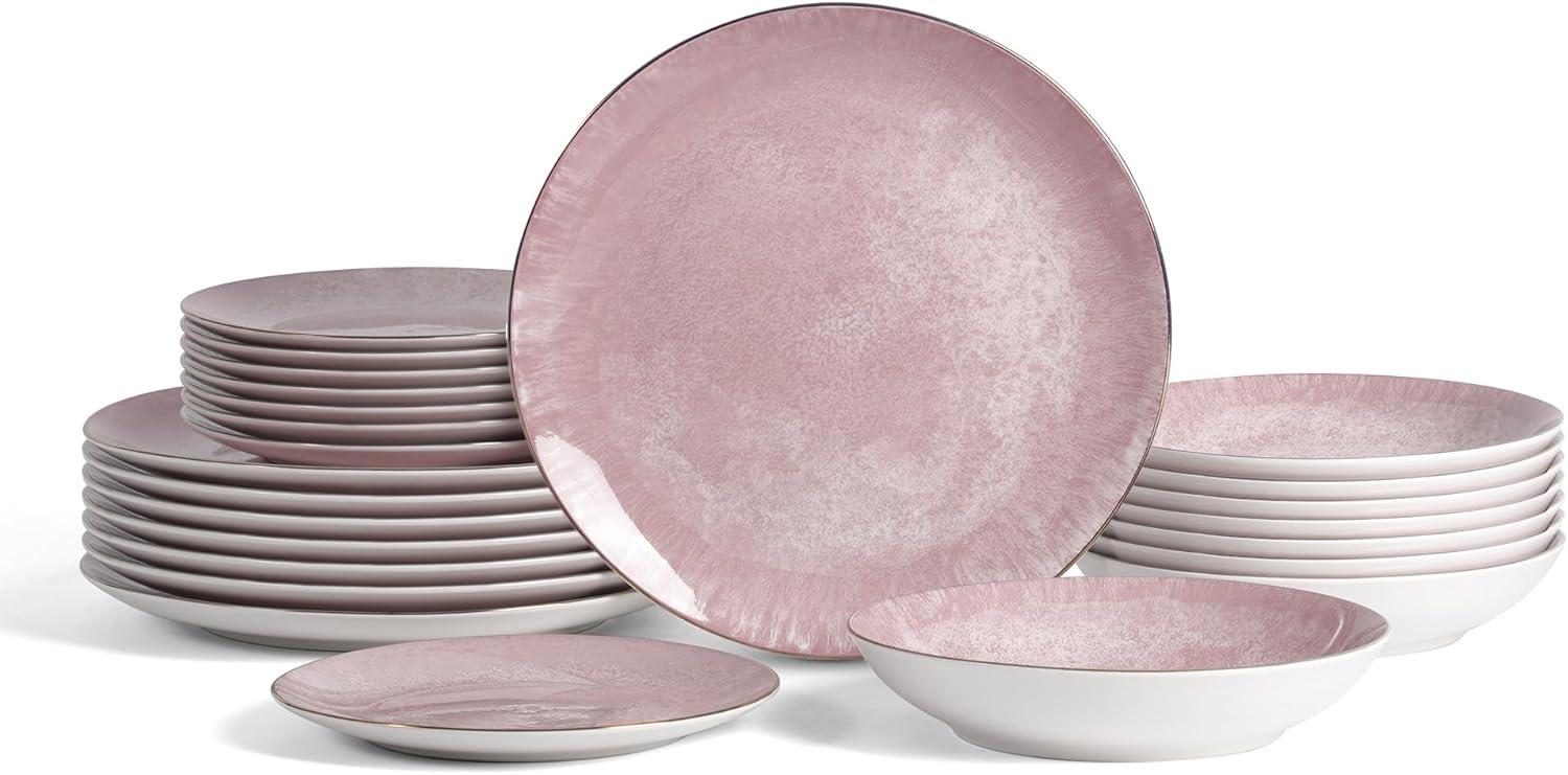 Christian Siriano Onyx 12-Piece Dinnerware Set Porcelain, Plates and Bowls Set, Hand Wash Dish, Dish Set for 4, Beige and Gold(Pink and Gold)