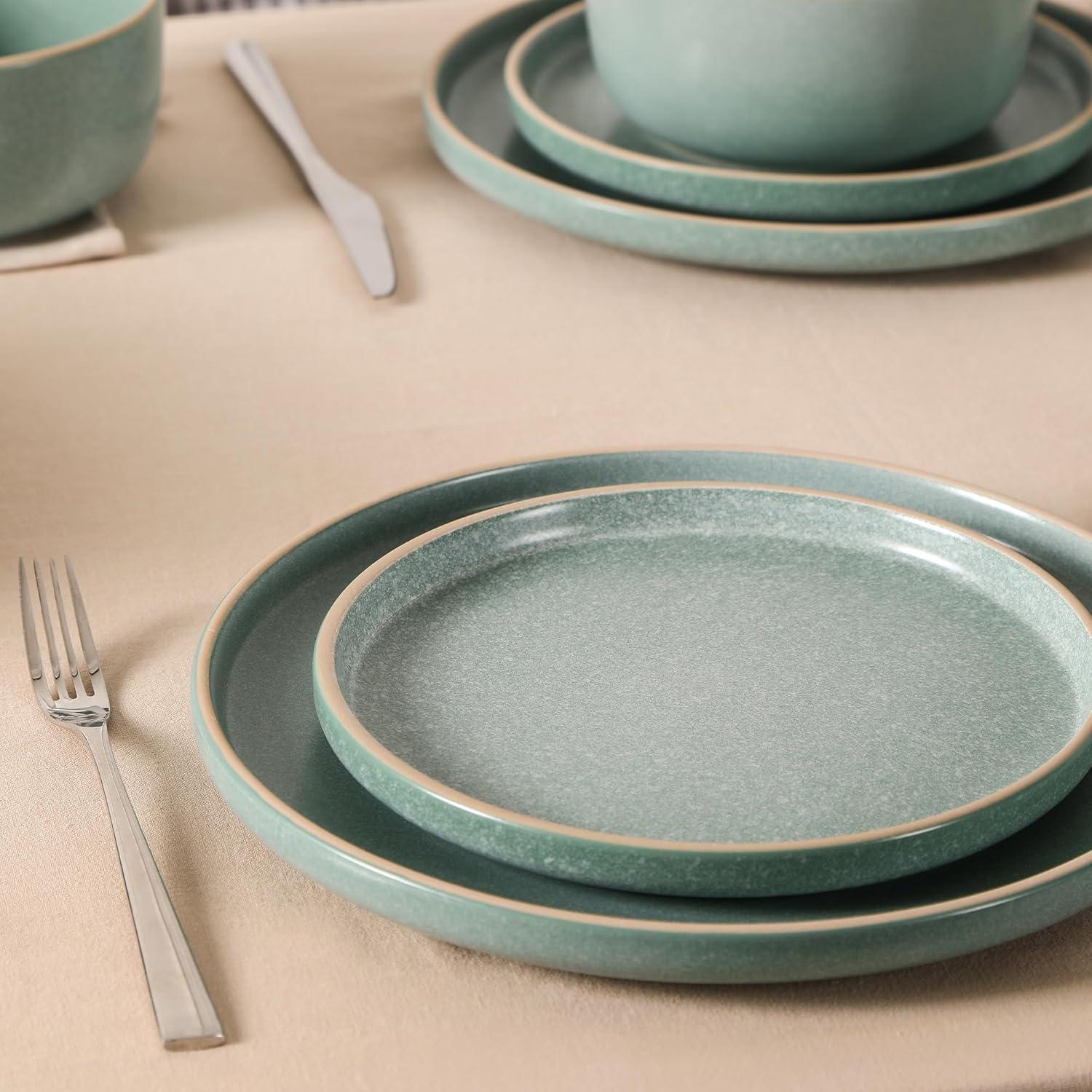 Set a harmonious table from morning to night with Earth & Clay's Amber Stoneware 12-Piece Dinnerware Set. With undeniable modern appeal, each piece is graced with subtle speckles and beautiful colored rims, for a sleek, simple, and classy look. If that weren't enough to add more depth and texture to your everyday dining, Amber also has a one-of-a-kind reactive glaze finish. Available in four exciting colorways, this set includes 4 10.4″ dinner plates, 4 8″ salad plates, and 4 6″ bowls.