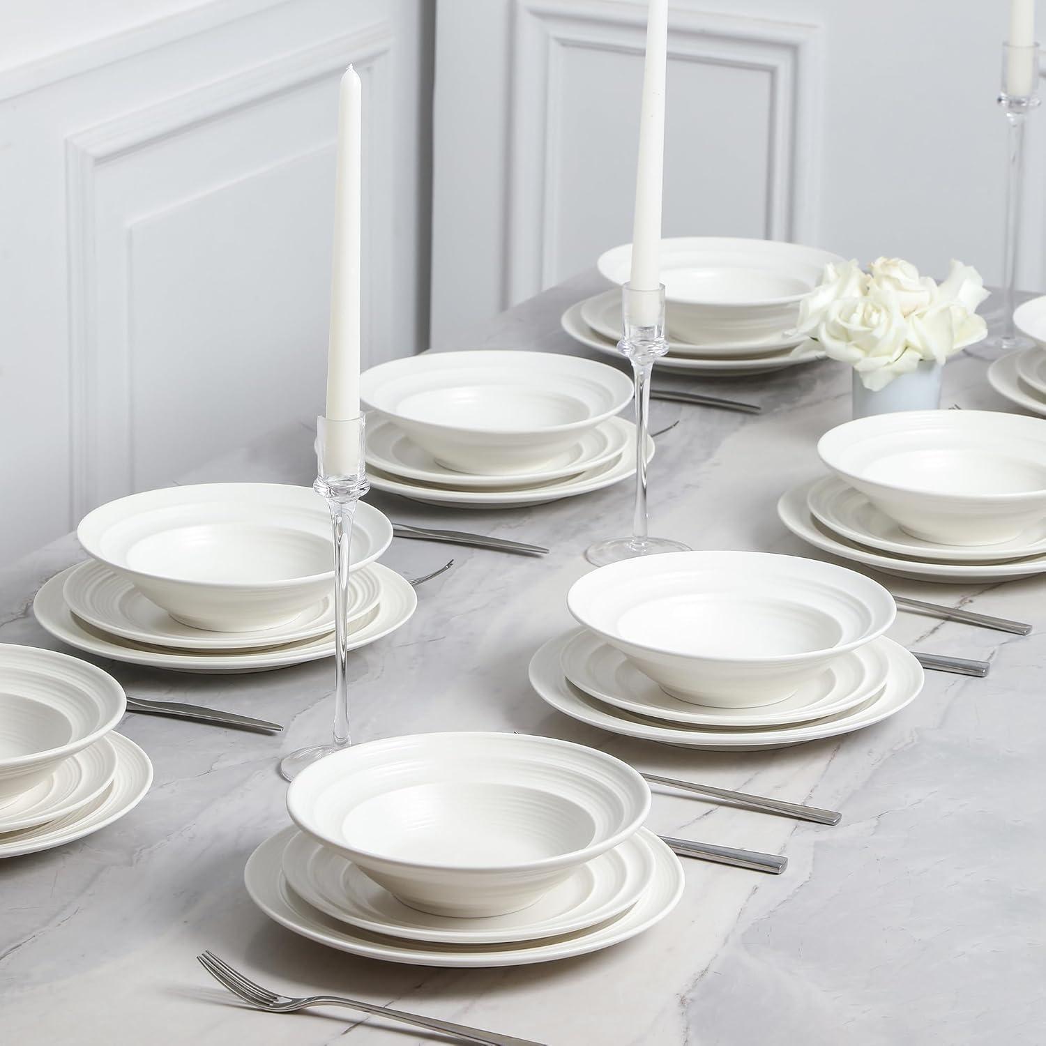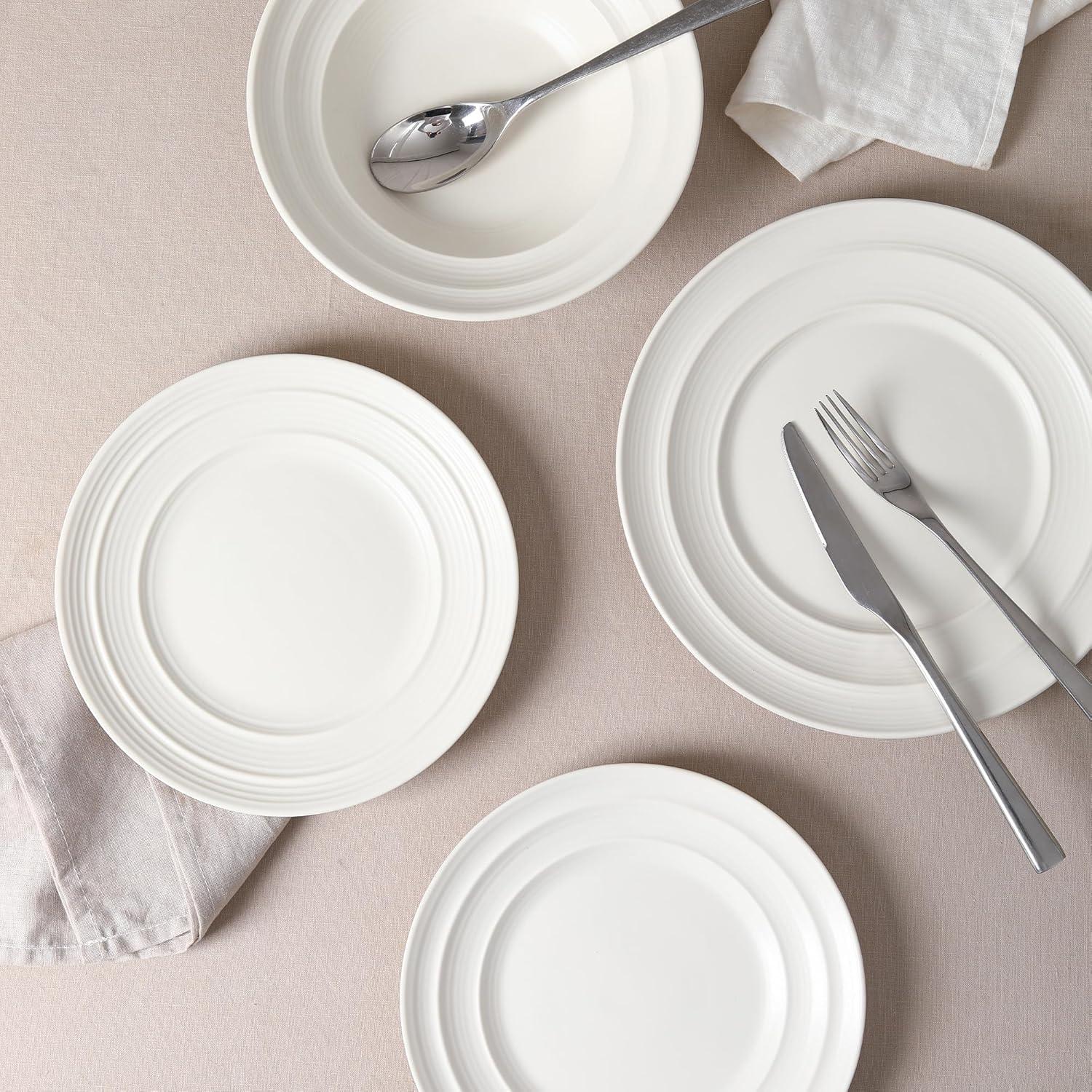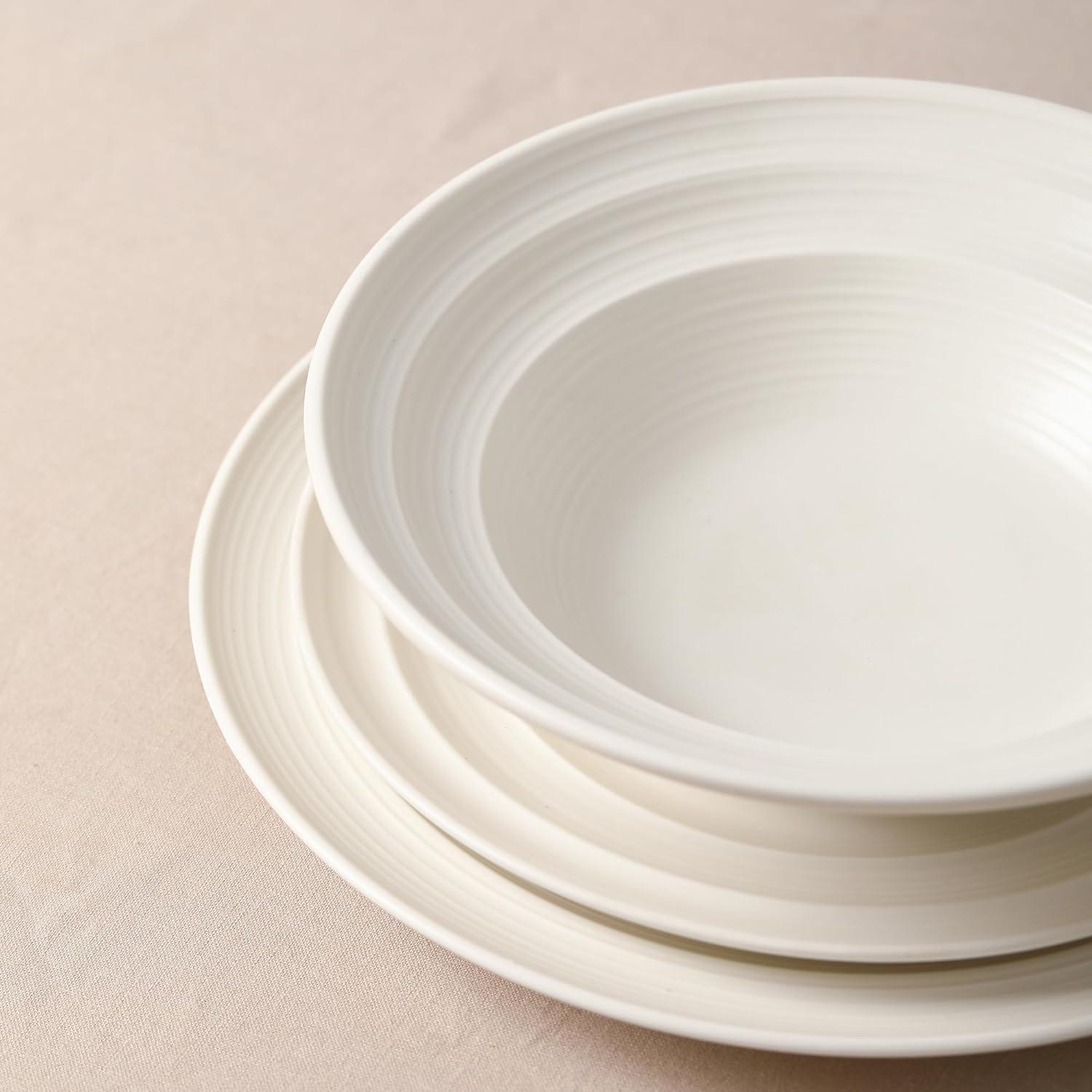 Service for 4: Celest settles you into every meal—from a quiet breakfast to a family dinner and beyond. Generously sized to include 4 wide, uniquely shaped 10″ dinner plates, 4 8.5″ salad plates, and 4 large 8.3″ pasta bowls, you're all set to serve any and every meal.