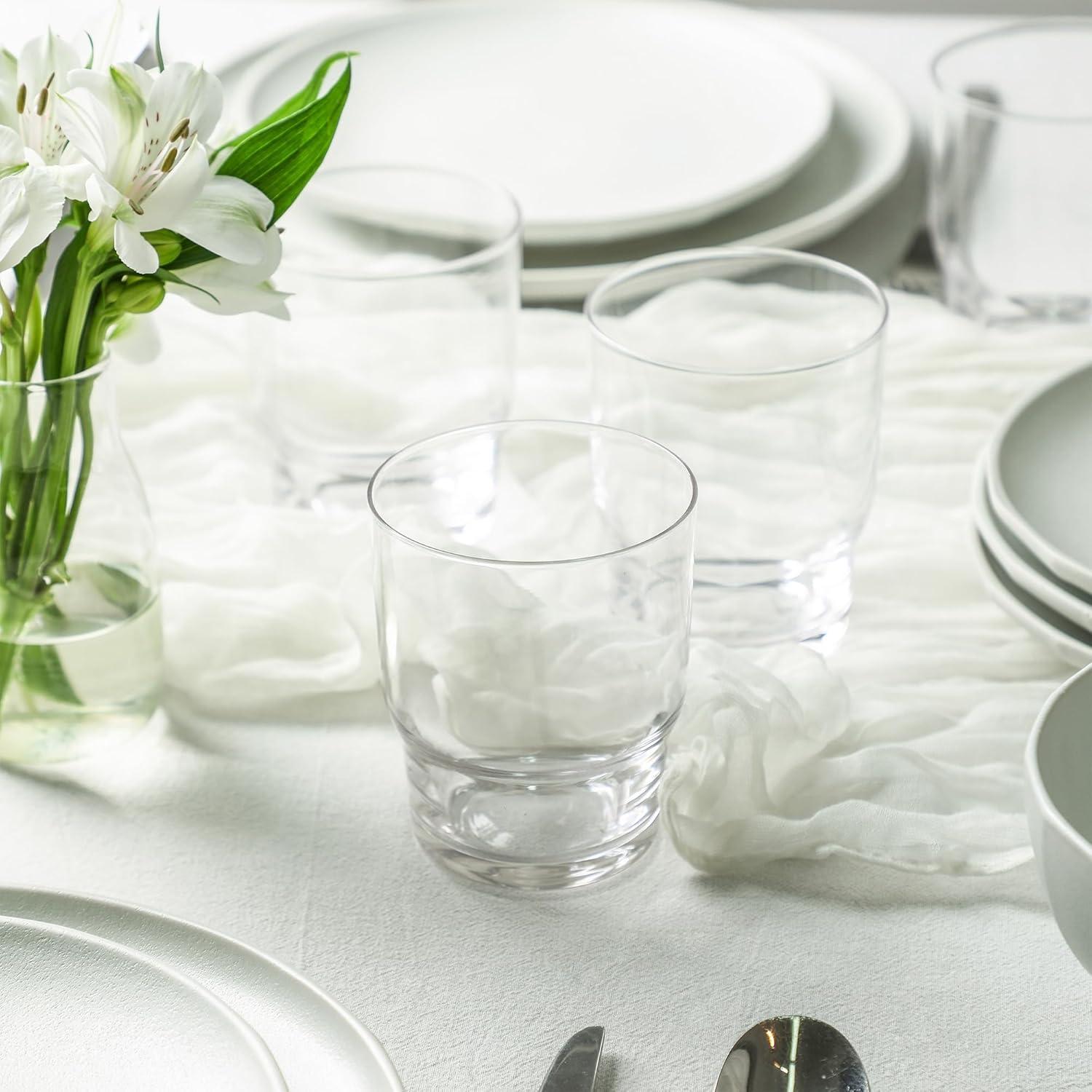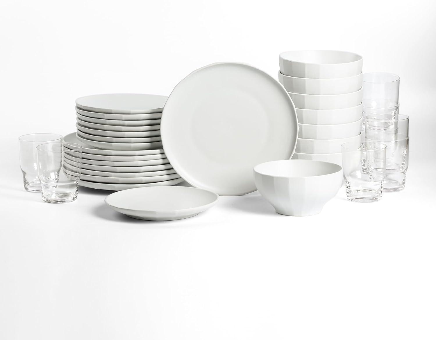Complete 32-piece dinnerware set includes 8 dinner plates (10”), 8 salad plates (8”), 8 cereal bowls (6.2”), and 8 clear glass cups—perfectly curated for serving four in style.